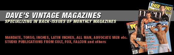 ![]() Dave, located in Florida, is generally up to his eyeballs in smut-rags. He buys quantities of Back-Issues from several of the publishers and from a variety of other sources. He has quite an inventory. He has also been working extensively on a database (many times a contributor to our own listings), and is able to help you find that much looked for edition. Go To Dave's Website: VintageGayMagazines.com for more information smutjunkies note: Dave has been a wealth of information, and you see his contribution to listings and elsewhere sprinkled throughout the site. Plus, if you want to complete a collection, just send him the wish list. Fast & Friendly. Thomas |