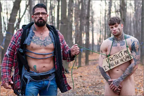 In an apocalyptic new world, the last and few men on earth have to fend for themselves for survival. While roaming the woods, Ryan Bones stumbles upon what resembles to be a trap. A half-naked and dirty Andrew Green, with a sign around his neck that reads: ‘Protect Me. I Will Be Ur Slave’.