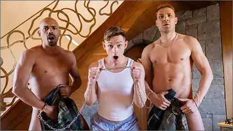Pacifist Eliott (John Jai) is upset at the thought of two prisoners of war (Alexandro Cabrera and Jordan Fox) being held in his home for the night when two military men bring them to the doorstep, and that night he steals the keys and goes to set them free. In the tower, the prisoners are reminiscing about their women back home and decide that since this might be their last chance to cum, they might as well take it. When Eliott walks in on them in an embrace, he asks if he can watch them together, and the men agree. He masturbates as they stroke each other, and Alexandro sucks Jordan, then rides his cock on the floor. Jordan drills the bottom from behind, and the guys jack off together. Time to make their escape…